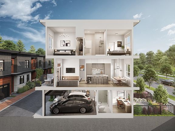Onward by Kadium Properties, located in the serene area of South Richmond, offers 19 townhomes, featuring 13 three-story townhomes, 4 two-story duplexes, and 2 two-story single detached homes—all showcasing the sought-after West Coast contemporary style popular in Richmond. Each unit includes a side-by-side two-car garage. The homes feature a European-style kitchen equipped with Italian appliances and German-brand cabinetry. Ceiling heights reach 10 ft in the living area and 11 ft in the primary bedroom. Plan AI, one of the final and most popular options, includes three bedrooms, a multipurpose room with an ensuite, and extra-high ceilings, along with a double side-by-side garage with an EV charging option.