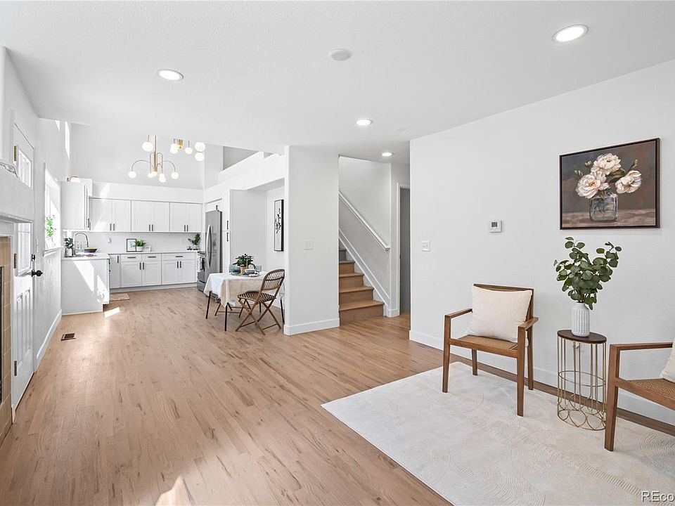 Recent updates include a new A/C, water heater, hardwood flooring, carpet, and fresh interior/exterior paint. The home boasts renovated bathrooms, newer stainless steel appliances, quartz countertops with a full-height backsplash, and white shaker soft-close cabinets. Enjoy thoughtful design touches like a fireplace, vaulted ceilings, LED lighting with secondary night-light features, designer floor-to-ceiling tile, and an undermount kitchen sink.