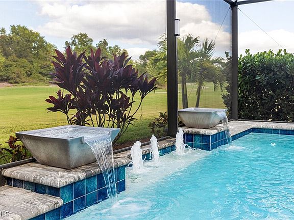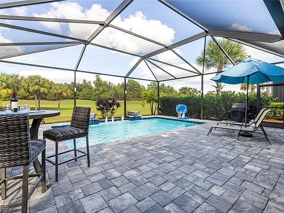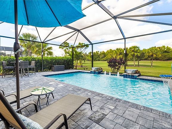 The stunning saltwater pool is the focal point of this exquisite home! Installed four years ago by Design Concepts, the pool features beautiful water features with display lights for evening enjoyment. The spacious pool deck offers ample room for relaxation or entertaining, all while enjoying views of the golf course and surrounding nature with no neighboring homes in sight, providing a high level of privacy. Plumbing is available for a potential summer kitchen, adding to the outdoor entertaining possibilities. Upon entering the home, you are greeted by a screened front entryway, providing an additional space to enjoy the beautiful Florida weather and welcome guests. The Nautilus floor plan offers a versatile flex room that leads into the great room, creating a seamless flow throughout the home. The kitchen appliances are newer, and the washer and dryer are very new, adding to the modern conveniences of the home. This WCI custom home boasts amazing 13-foot ceilings and 10-foot doors, creating a sense of grandeur throughout. The plank tile flooring adds a touch of elegance, while plantation shutters adorn all rooms, providing both style and functionality. Accordion shutters on all windows and doors, as well as electric storm smart shutters on the lanai, offer peace of mind during inclement weather. The high-end furniture is negotiable, allowing for a seamless transition into this luxurious home. The garage is equipped with extra storage areas, providing ample space for belongings. Additionally, the golf cart is available for purchase, adding to the convenience and enjoyment of living in this community. Located in Pelican Preserve, a sought-after 55+ community that has received national recognition for its exceptional lifestyle amenities, this home is sure to attract attention. Don't miss out on the opportunity to live the dream in this vibrant community. Experience the best of what Pelican Preserve has to offer - you will love it here.