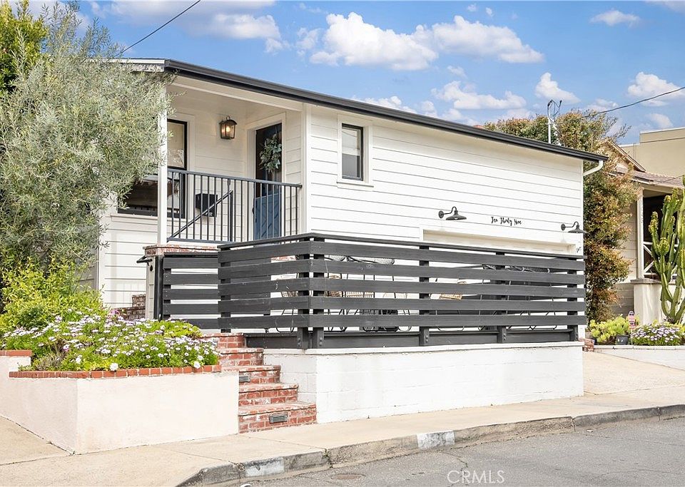 This charming beach bungalow, offering two bedrooms and one bath in 1023 square feet of updated living space, will have you at hello. A brick walkway leads around the ocean view front deck – complete with spacious seating area – and straight to the cheerful Dutch door entry. Fresh white paint and an enticing fireplace with modern designer tiles in the living room invite you into the space. Hardwood floors, a dining nook, and a bright and sunny kitchen are delightful, and give the space a modern yet cozy feel. The kitchen features stainless appliances, a breakfast bar, contemporary pendants, bright white countertops and subway tile, a farmhouse sink, and open shelving. The adjacent, convenient laundry room is wallpapered with a cheerful blueprint, and another Dutch door leads to the verdant, private backyard. Entertain in style in this grassy space, where white lights crisscross the yard and the patio holds a barbecue, outdoor living room and dining area with ease. Two immaculate bedrooms are sunlit and modernized, while the adjacent full bath boasts designer tile flooring, a chic vanity, and contemporary lighting. Convenient to local schools, shopping, and dining, this centrally located gem makes commuting a breeze. If you’re looking for the ideal bungalow to call your own in the wonderful hamlet of Hermosa Beach, you’ve come to the right place!