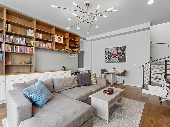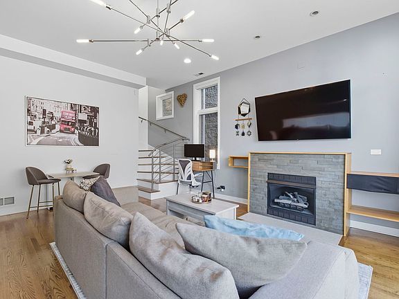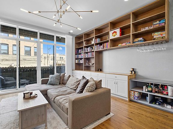 This incredibly stylish and modern 2-bedroom, 2-bathroom bi-level home in the heart of East Village/West Town offers the perfect blend of design, comfort, and location. Nestled in one of Chicago's most walkable neighborhoods, you'll find yourself just steps from vibrant restaurants, cozy coffee shops, and trendy boutiques, with all the charm and convenience of city living right outside your door. The thoughtfully designed layout includes two sizable private outdoor decks-one off the family room, ideal for entertaining guests, and another off the primary suite, perfect for relaxing with a glass of wine after a long day. Inside, the spacious family room makes a bold statement with soaring 11-foot ceilings, an eye-catching designer Sputnik-style chandelier, a full wall of custom built-in cabinetry and shelving, and a beautiful wood waterfall countertop. Natural light pours in, creating a bright and welcoming space that flows seamlessly to the private deck. The kitchen has been updated to perfection, featuring rich midnight blue cabinetry with brushed gold hardware, accent lighting, a dual-basin sink, a sleek tiled backsplash, quartz countertops, and stainless steel appliances. A smart built-in system adds both style and function with dedicated storage for flatware, cookware, and wine glasses. The hall bathroom is equally impressive, with a stunning mosaic inlay of grey, green, and blue tones, white marble surround, a floating vanity with a vessel sink, and a walk-in shower that exudes modern elegance. The bright and airy primary bedroom offers a wall of windows, a large walk-in closet, private outdoor space, and an impeccably updated en-suite bathroom. This spa-like retreat features a deep grey dual-sink vanity with textured basins, white quartz countertops, porcelain 12x24 floor tiles, marine blue and grey subway tile surround, and a custom three-panel lighted mirror-each section hiding spacious medicine cabinets for added convenience. Additional highlights include hardwood flooring throughout, abundant in-unit storage, generous closets, and a covered garage-operated carport that is deeded with the property. This exceptional home is truly move-in ready and offers the perfect opportunity to enjoy upscale city living in one of Chicago's most desirable neighborhoods.