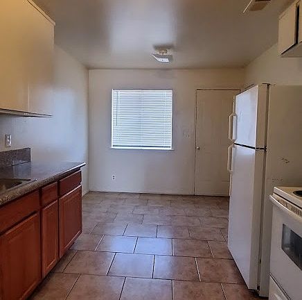 Two-bedroom, one-bathroom apartment. Includes fridge and electric stove. Features a patio, carport, and central air conditioning and heating.