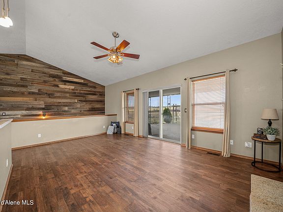 Check out this great opportunity to own acreage and a larger 5 bedroom home. Open floor plan with wood laminate floor throughout, cozy propane gas fireplace in living area. Kitchen includes newer black stainless appliances and beautiful cabinets. 3 main floor bedrooms and 2 full baths. The primary suite includes a full tiled shower and a heated jetted tub. Going down stairs you will notice 9' walls to open up the basement. The large family room or rec room includes the pool table and bar. 2 additional bedrooms and full bath are located on far end. Large covered back patio. Utilities are East Greenacres water, septic system, propane gas and Avista power. Retain your space - No development will surround you. ** Per BPA, you can build up to 1000 sf barn within easement (concrete floor ok), can have animals, fence, farm, tree farm, or store vehicles within easement. No living units or fires in easement area. **. Septic is pumped.