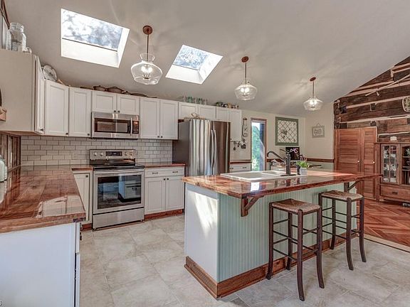 We are so excited to share this charming 3 bedroom home on 2 acres with you. From the historic front and side doors to the built-in cabinetry, hardwood floors and original exposed logs, the character is amazing. The newly remodeled kitchen will take your breath away. The counters are rough cut walnut with an epoxy, absolutely gorgeous. The light colored cabinets with cathedral ceilings and the large new windows create a fresh and airy feeling throughout the kitchen and dining area. Full bathroom on the main floor has been recently remodeled. The slate wall in the kitchen is from the slate roof from the original part of the home. Hardwood floors throughout are natural cherry, the border is maple. The spacious living area with a wood burning fireplace has the original exposed logs from when the home was a log cabin. The cedar sun room has its own heat and air conditioning unit. The main bedroom on the second level offers cathedral ceilings and a full bathroom. The third bedroom is on the lower level along with another bathroom. The walk out basement is finished and offers plenty of extra living space or storage. The home has several updates, electric has been updated to 200 amp service, appliances were new in 2018, new storm doors, outside of the home completely re-sided with durable, engineered wood in 2019, new roof on the garage in 2019, and all new toilets and faucets. This home has been impeccably cared for and maintained.