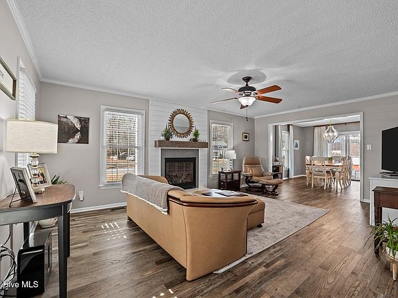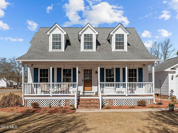 As you approach this beautiful Cape Cod home situated in the cul-de-sac known as Benjamin Circle, you will be immediately impressed by its symmetrical facade and charming dormers. The welcoming front porch greets you as you enter the house, featuring a spacious living room adorned with stunning LVP flooring. Abundant natural light brightens both the living room and dining areas. A unique, cozy fireplace designed by the current owner serves as an impressive centerpiece. The soft gray color scheme exudes peace. The rooms seamlessly flow from one to another. The completely remodeled kitchen will amaze you with its smart drawers and practical design. Gorgeous quartz countertops, white Shaker cabinets, a beautiful deep composite sink with brushed gold faucets, and top-of-the-line Frigidaire Gallery appliances will make you want to spend time in the kitchen. Enter the downstairs master bedroom suite on your right. Spacious enough for a king-sized bed with a chest and bedside tables, it features a large walk-in closet and a bathroom with double sinks and tiled flooring. You'll enjoy your morning coffee in the sunroom or on the patio. The two large bedrooms upstairs also provide impressive closet and storage space. Speaking of storage, head out to the insulated garage and wired workshop. This home combines beauty with practicality. The large lot features a well-manicured yet easy-to-maintain garden. This house is conveniently located near both Washington and Greenville, making it suitable for various demographics: couples, families, and retirees. The quiet, safe neighborhood is appealing--no city taxes, no HOA, close to Tranter's Creek, and no flood insurance required. This is a must-see! Be sure to check out the attached updates and features in the documents.