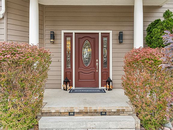 Inside, inlaid wood flooring and vaulted ceilings give each room depth and character. The main level features a welcoming entry, formal dining room, and living area with a fireplace. The kitchen includes solid wood cabinetry, a breakfast bar, and space for casual dining. A main-floor ensuite, half bath, and laundry room add convenience to the thoughtful layout. Upstairs, the expansive primary suite with beautiful views spans the full level with a large bedroom, soaking tub, two walk-in closets, and a private sitting room. The walk-out daylight basement offers a large second living area with a fireplace, generous storage, two bedrooms, a full bathroom and an additional ensuite bedroom. The second living space opens up to the large yard, via a patio that includes a hot tub.