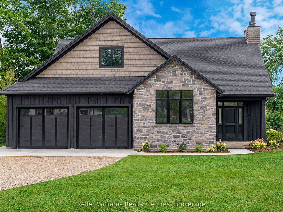 This brand new construction, custom-designed residence is nestled in an exclusive enclave of just 12 private homes in the coveted Beaver Valley Woodlands. Crafted for those who value design, privacy, and seamless indoor-outdoor living, this 3,546 sq ft, 5-bedroom, 4-bath modern alpine retreat is set on 1.37 acres bordered by 100 newly planted spruce, pine, and fir. The striking exterior pairs onyx board-and-batten with cedar shake and natural hand-laid stonework for bold, elegant curb appeal. Inside, soaring 13-ft vaulted ceilings and floor-to-ceiling windows flood the great room with natural light, anchored by a dramatic fireplace clad in sophisticated porcelain stoneware. This true wood-burning hearth is the heart of the home, whether its a quiet night by the fire or an evening of entertaining. Every finish has been elevated, from the hardwood floors to the 8-ft solid poplar doors and trim. The kitchen is a showpiece: full-height custom wood cabinetry, a 7-ft quartz island in soft sage, artisan-glazed tile backsplash, and fully integrated stainless steel appliances. The main-floor primary suite offers a custom walk-in closet and a luxe ensuite finished in porcelain tile with a freestanding soaker tub, glass-enclosed rainfall shower, and warm wood vanity with quartz counters. Upstairs, two guest bedrooms--including one with its own fireplace--share a chic 3-piece bath. The lower level extends the homes sophisticated aesthetic, with a floating staircase accented in glass and steel leading to a bright rec room, full gym, two additional bedrooms, and a 4-piece bath. Heated exposed aggregate floors add polish and warmth throughout. The oversized garage is equally refined, with in-floor heating, waterproof wall finish, and epoxy floors, ideal for storing and maintaining everything from bikes to seasonal gear. Backed by the 7-year Tarion New Home Warranty, 104 Butternut Court is a refined retreat for those who live fully--in every season.