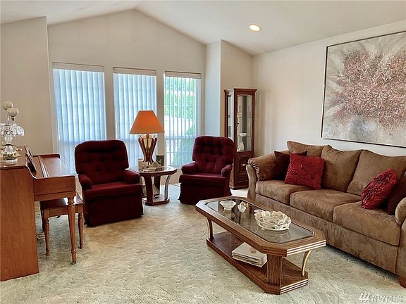 So many extras come with this Lovely ONE LEVEL HOME WITH SHOP! Custom built in 1994, 3 bedroom, 2 full bathrooms, heat pump, vaulted ceilings, skylight, double sided fireplace can be seen from family and living room, 4 yr. old roof, 2 car attached garage. Double doors to the Master suite - walk in closet -slider to the back deck. Sit in the hot tub-listen to the pond and enjoy the view of Mt. Rainier. Free standing pool w/ slide is heated and private. Shop approx 24x28 w/ 12' drs-bring the RV!