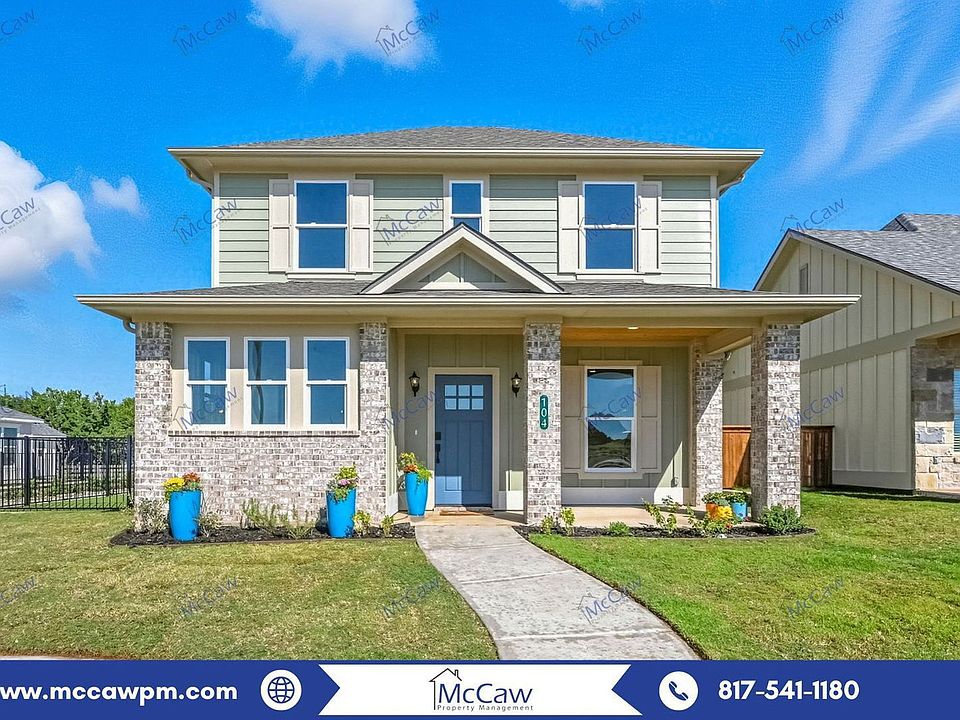 Experience luxury living combined with relaxing Granbury lifestyle. This beautifully staged home is a part of a special new construction lease neighborhood that gives a nod to the history of real estate architecture. The homes have a "Period Home Design with State of the Art Finishes". The unique architecture of the neighborhood is designed by a national award-winning architect who highlights the real estate styles of Coastal Farmhouse, Granbury Stone Traditional, 1940's Brick Ranch, and 1920's Craftsman styles. This home was designed with the "1940's Brick Ranch" flair in mind. The home boasts 3 spacious bedrooms and 2.5 well-appointed bathrooms. It is designed with high efficiency in mind, featuring Pella windows and foam insulation to ensure optimal energy savings. The kitchen is a chef's dream with an appliance package, soft close cabinets, and a premium deep sink. The rear entry garage and extra parking add an extra layer of privacy and convenience. Step outside to your private turf courtyard, a perfect oasis for relaxation. The property also includes professional landscaping, with outdoor water and maintenance covered, allowing you to enjoy the beauty without the hassle. This turnkey property offers 'lock and leave' living, ideal for those with a busy lifestyle. Nestled in a walkable neighborhood, you can enjoy leisurely strolls right from your front porch. Situated in central Granbury this home is walking distance to the popular HEB and Kroger grocery stores. Experience luxury living at its finest, the simplicity of low maintenance, and an of unapparelled sense of community.