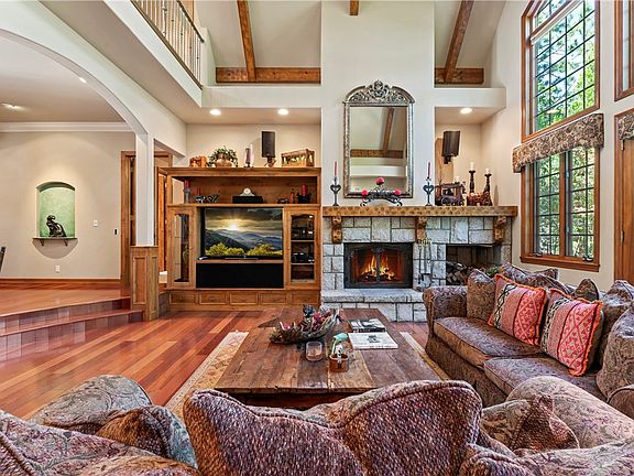 Immaculate, custom built luxury property located within the private gates of prestigious Cedar Ridge Estates! 4,185 sq ft on a .74 of an acre parcel. 4 beds/4.5 baths, all bedrooms en suite! Truly a rare offering in the mountains, with only a few steps into the main level living area. One master en suite and laundry room conveniently located on the main level. Double door grand entryway leads directly into a spacious living room offering; soaring 3 story vaulted ceilings, floor to ceiling windows, cherry hardwood flooring, chiseled granite hearth and fully equipped wet bar with granite counter bar top. No detail overlooked with high quality finish work window casings, open beams, crown moldings, oversized baseboards and custom iron railings. Formal dining room leads to a spacious gourmet kitchen boasting stainless appliances, large center island/breakfast bar top and an abundance of cabinetry throughout. Upstairs opens up to a 2nd master en suite with walk in closet and soothing corner fireplace. Private deck attached overlooking the patio below. Two en suite guest bedrooms, one including a 2nd private deck overlooking a tranquil Pine tree forest. Open concept wide hallway enters into a large 19’x35’ game room featuring hard wood flooring, and a 2nd wet bar w/ granite countertop. The perfect room for family movie nights, kid bunk room, home office or home gym! Exterior grounds include a large concrete rear patio off the living room, fully irrigated front yard and a natural gas whole house generator system! Oversized 3 car garage and full lake rights to top it all off! This is a low maintenance property with the exterior freshly painted in September 2022. Tour today!