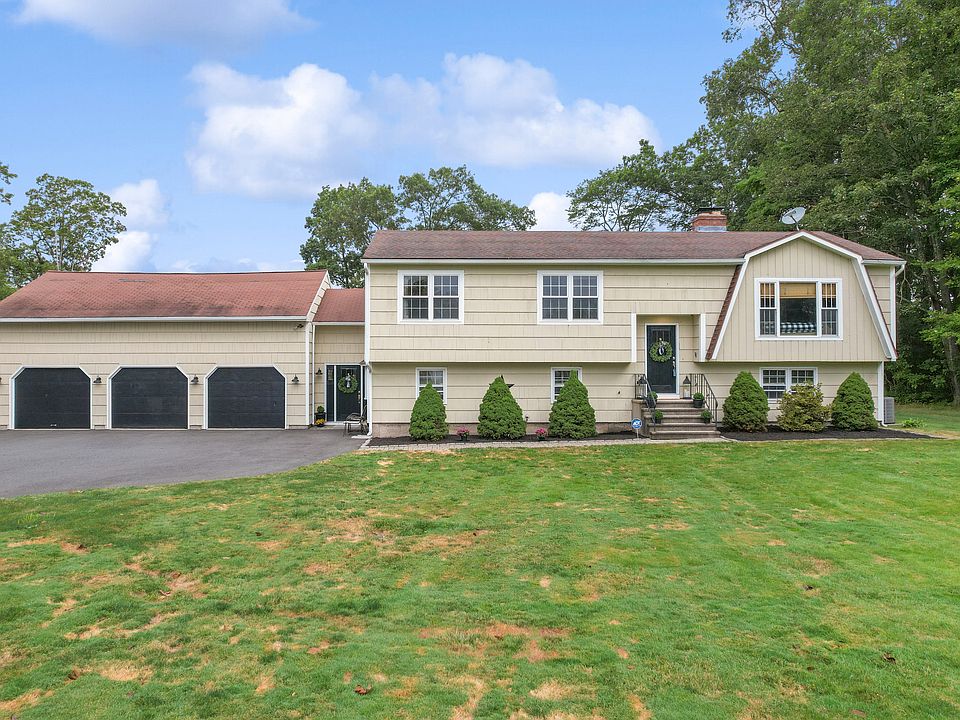 Resounding, 5 Bedroom, 2 Bath, 2400 SF+ Raised Ranch w/ Full in-law proudly situated on 1.3 acres of lush, professionally landscaped emerald, green grounds. This open concept, Cavernous, fully updated abode boasts hardwood flooring throughout the entire upper level. The generous, eat-in kitchen is outfitted w/ beaming Granite Countertops, a full appliance package, and is further enhanced by slider access out to private rear deck overlooking nature's splendor. The distinct, recessed living room is drenched in sunlight and charm, enhanced by an open flame wood burning fireplace. The Majestic, Primary Bedroom broaches 850 SF and is accentuated by engineered hardwood flooring, open timber beams, and a separate access door, giving homeowners a private oasis to retreat. Recently updated full bath features tile flooring and a shower/tub combo. Main level living space is rounded out by 3 spacious bedrooms each w/ sufficient closet space. Lower level living space can be utilized as an in law suite by providing owners with full kitchen w/ walk out patio access, and a capacious fully carpeted bedroom w/ wood burning fireplace. Attached 3 car garage provides ample space for vehicles, & lawn equipment. Additional value realized as owner's gander upon the breathtaking fully landscaped level grounds, challenging to be replicated by its peers. Updated mechanicals, a new driveway, and CAIR further round out the homes intrinsic appeal. Do not miss your chance to behold this Captivating Jewel!!