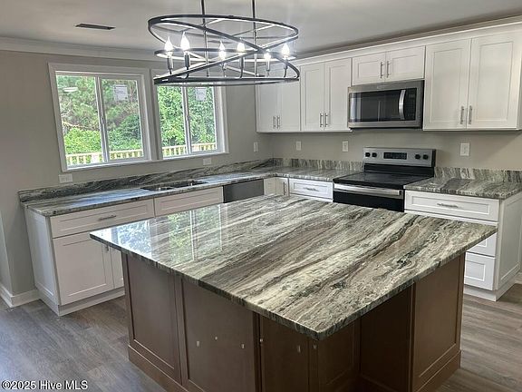 The kitchen also has built in book cases with an electric fireplace with speakers. A large deck off the kitchen for enjoying the nice NC weather.