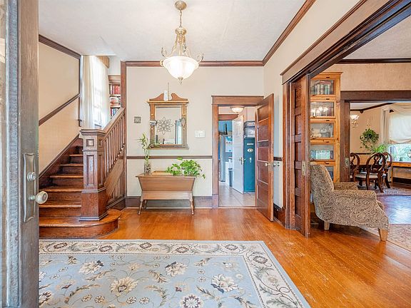This charming historic property exudes timeless character and offers a truly enchanting living experience. Boasting 4 bedrooms and 3 full bathrooms, this residence combines spaciousness with classic elegance. As you step inside, you'll be captivated by the beautiful hardwood floors that grace the main level, while the carpet upstairs hides the treasure of hardwood waiting to be revealed. The warmth of the living room is enhanced by a cozy gas fireplace. The allure of this home continues with its unique pocket doors, allowing for both privacy and a seamless flow between rooms. The kitchen features marble countertops accented by tile backsplash. The primary suite offers the convenience of a dedicated laundry area and spacious walk-in closet. Attention to detail extends beyond the interior, as the lower roof has been recently replaced. The front porch has also been lovingly painted, adding to the property's curb appeal and welcoming ambiance. Situated across the street from Kiwanas Park!