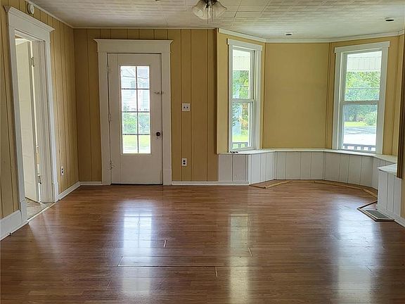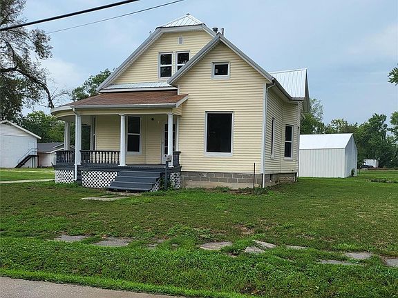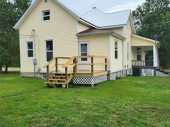 A sensibly priced place to call home! This year the following items have been completed: New furnace & central air added, new vinyl windows installed, lots of new painting inside and out, some floor coverings were replaced, a new deck was added to rear entrance and various other repairs were made! Attractive wrap-around porch to enjoy. You'll love the size of living room! Handy eat-in kitchen with plenty of cabinets. Spacious main floor laundry room has adjoining half bath. Two bedrooms. If you're energetic, unfinished attic could easily provide 4 more bedrooms & a bonus room. Two-car detached garage. Corner lot. Enjoy the small town life where folks know your name and wish you well!