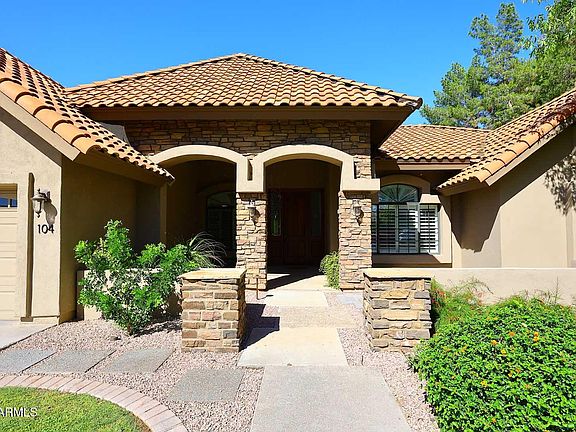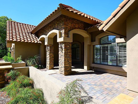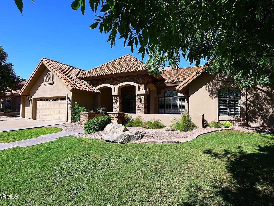Rarely available custom single level home in exclusive gated community of Graystone in south Tempe. A brick paver front patio with bench seating welcomes you to the home. Upon entry, a grand foyer opens to the formal living & dining rooms with soaring vaulted ceilings, elegant chandeliers and stone & hardwood flooring. With no interior steps, the space flows seamlessly to the gourmet eat-in kitchen with high end appliances & center island. The adjoining family room with cantera stone fireplace & wet bar with wine fridge is perfect for entertaining or cozy family gatherings. The primary suite boasts hardwood floors and a spa-like bath with frameless glass walk-in shower. The 5 bedroom/3 bathroom split floor plan affords privacy and flexibility for family and guests. With a north/south exposure, the extended travertine stone patio is shaded throughout the day & overlooks the private backyard with pebbletec diving pool & synthetic grass. A built-in BBQ with bar seating is perfect for outdoor entertaining. A 3 car garage with attached cabinets & a large exterior closet provide ample space for storage. Freshly painted interior in 2025, new exterior stucco & paint in 2023, two new AC units in 2020 & 2021, both water heaters replaced in 2025, all new circuit breakers & external surge protector installed in 2024. Vacant & move-in ready. Hurry before it's gone!