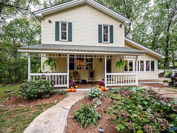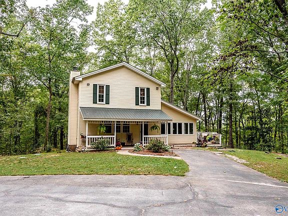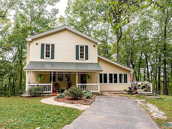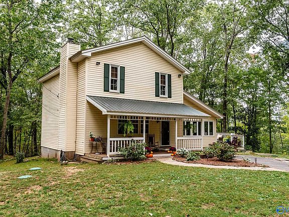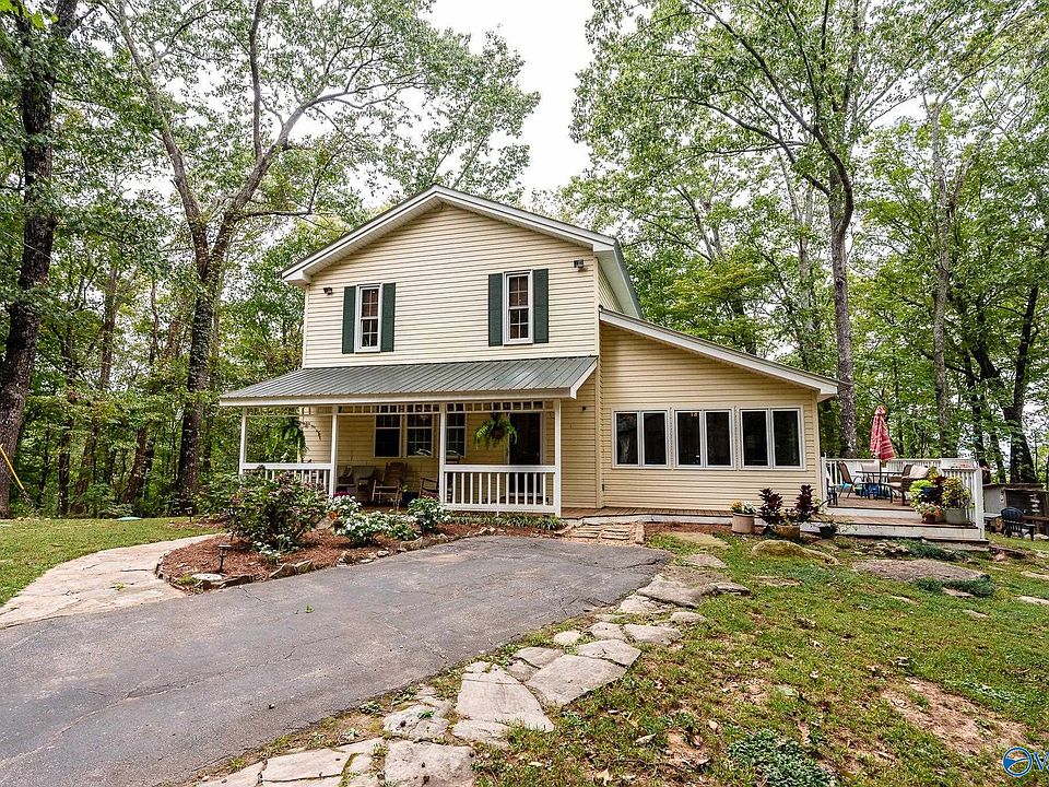 ADORABLE COTTAGE style home with views of the Tennessee River located in Priceville School District. 25 minutes from Gate 3-Redstone Arsenal. Your home will be your sanctuary on this private lot with +/- 1.3 acres. 3BR-3BA, large living area, bonus room - many UPDATES throughout. Eat-in kitchen with quartz, shiplap, farm sink, vaulted ceiling and windows galore for natural light. Vaulted ceilings w/rustic beams in lower bedrooms. Master Suite w/sitting area and 2 large closets. 2-car detached garage with tool storage area/carport. Detached storage building. Wood burning fireplace. NO CARPET. Metal Roof. Enjoy the view from the back porch/yard. Close to Wheeler Wildlife Refuge and boat ramp.