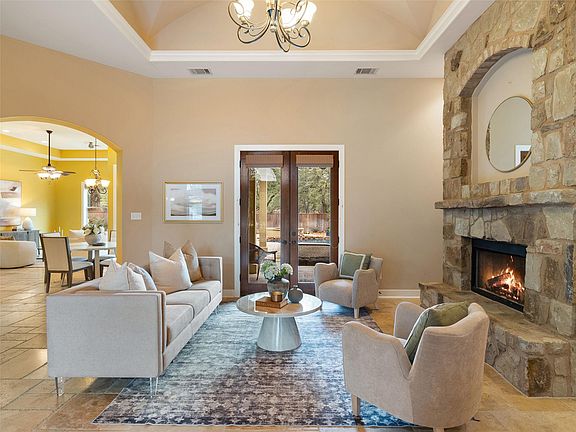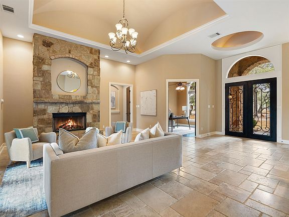 Timeless Tuscan style in private gated community situated on over an acre with an abundance of towering oak trees. An open floor plan offering many flexible options, multiple living areas, 4 spacious bedrooms, gourmet kitchen with granite counters plus an abundance of cabinet storage, a floor-to-ceiling stone fireplace to enjoy during all your gatherings + 8' French doors leading out to the breezy covered terraces and pool/spa. Ready for your Texas pool parties and BBQ's! Spacious master suite with patio access plus luxurious bath offering a jetted soaking tub, large walk-through shower + his/her vanities and closets. Also as a bonus, FOUR (extra deep) garage spaces! 2-car attached to main house + a detached 2-car plus fully finished out and air conditioned upstairs area, an ideal space for your home business/storage/craft or workout. This property is one-of-a-kind with endless possibilities.