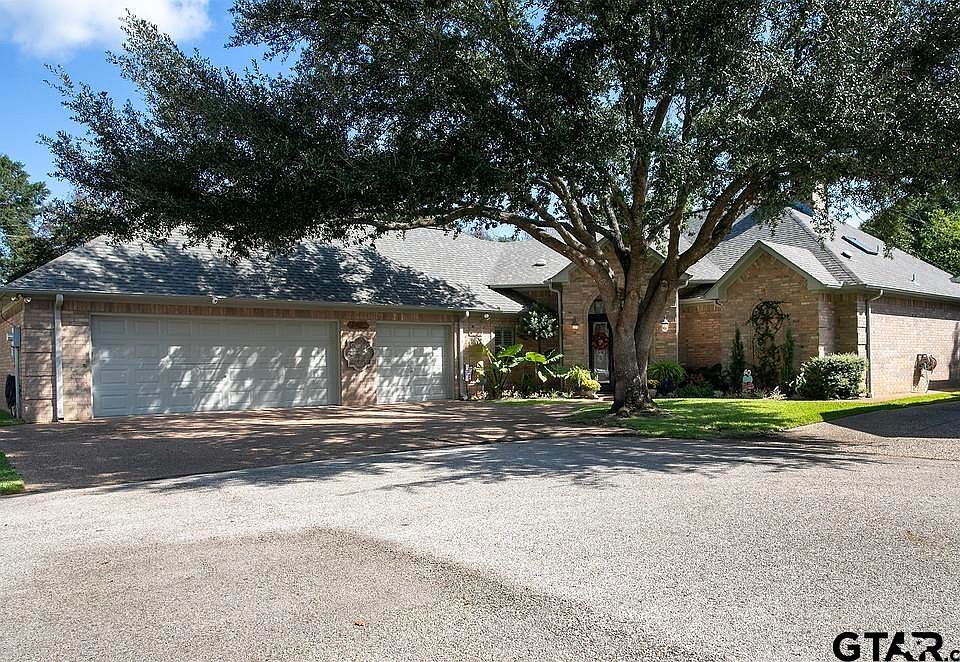 Welcome to 104 Glen Ridge Lane, a thoughtfully designed home in the exclusive gated golf community of Emerald Bay, just 12 miles south of Tyler on Lake Palestine. Tucked away on a quiet cul-de-sac this home combines refined details with everyday comfort. Inside soaring vaulted ceilings and walls of windows create an airy, open floor plan. Scraped hardwood floors, marble fireplace, custom built-ins, motorized shades and plantation shutters are a few of the quality features in the living room which flows into a dining space with a tray ceiling and designer lighting. A bright garden room extends to a 47 ft deck with clear views of Garden Ridge Park, perfect for morning coffee or evenings in the hot tub. The gourmet kitchen is equipped with upgraded KitchenAid appliances, a built refrigerator, under-counter ice maker, custom pull-out cabinetry, and abundant natural light from a skylight. The primary suite offers motorized shades, a spa-like bath with marble vanities, walk in shower with dual heads, skylight, and a spacious closet with custom built-ins. Two additional bedrooms feature private bathrooms and share a shower in a Jack-and Jill arrangement. A guest half-bath off the living room area completes the layout. Practical touches abound: central vacuum system, updated dishwasher and disposal (2024), and a utility room with sink, storage and natural light. Emerald Bay residents enjoy golf, lake access, community pool and resort-style amenities, all in a secure, welcoming community.