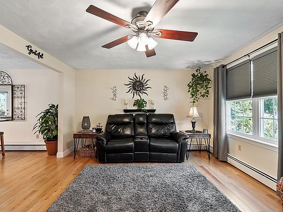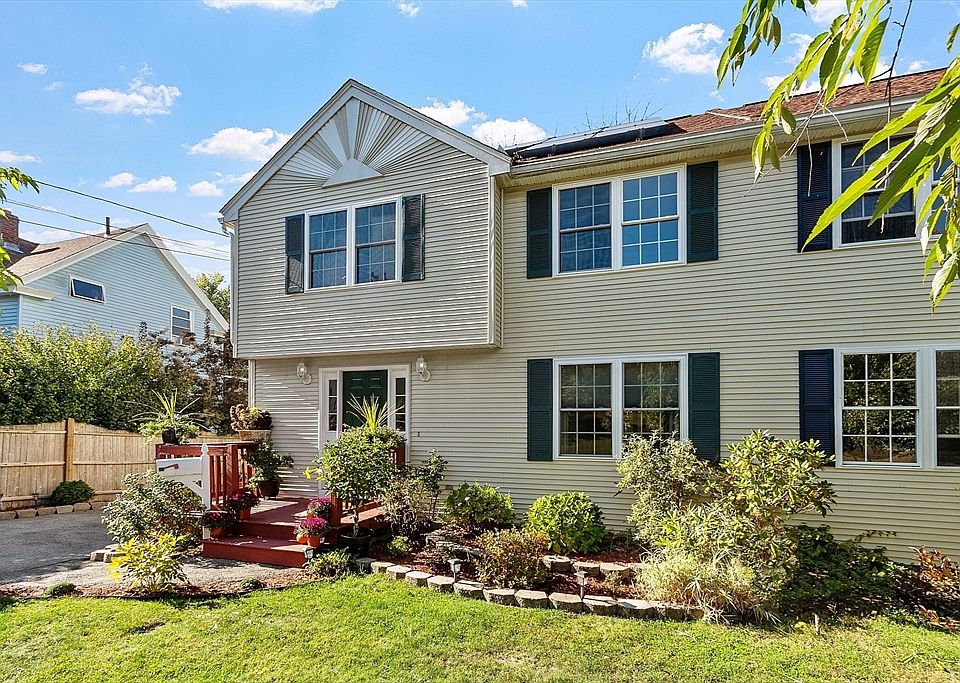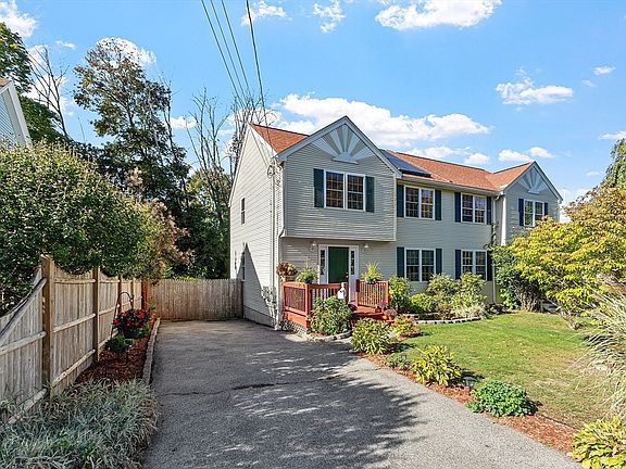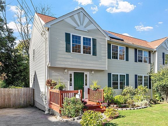 Lovely, affordable, updated condo w no condo fee and solar subsidized electricity that keep costs down. Hardwood thruout 1st floor includes kitchen, dining, living room, double coat closet, and half bath. Pretty kitchen cabinetry with pantry has granite counters, peninsula bar seating, and stainless appliances including 5-burner gas range. Adjacent dining room has cabinet-matching island table and french door to oversized private 15x11 deck with stairs to expansive grassy back yard. Upstairs 3 bedrooms w new flooring including primary bedroom with direct access to the full bathroom. Pull-down attic provides added storage plus full-height large unfinished 24x24 basement offers lots of space and has access to large back yard. Private fr & bk entrances, garden and driveways feel so much more personal than a row townhouse. So many updates include roof, kitchen cabs/counters/lighting 2022; 1st level wood floors 2020; electrical panel and many windows 2023; carpet, paint and deck stain 2025.