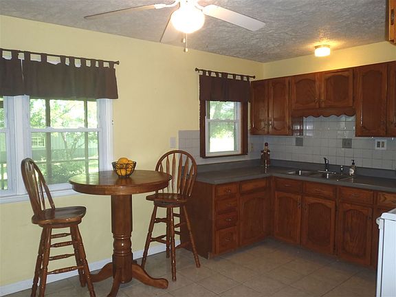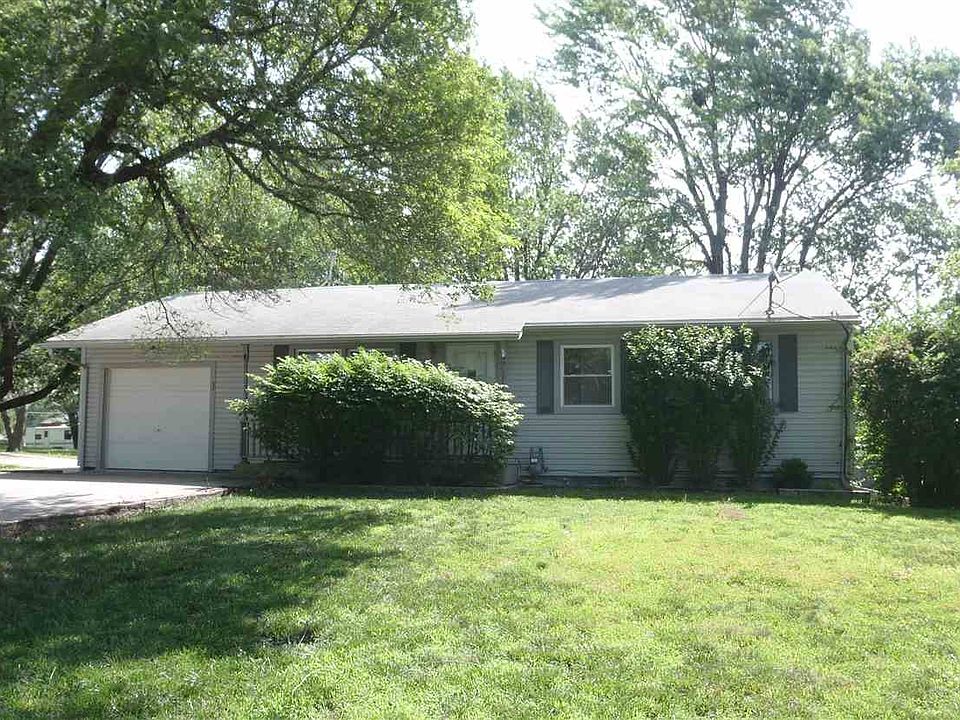 Small town, country living on Spacious corner lot! Mature Trees, Large 30x40 Morton building/detached garage/workshop w/finished interior, insulated, Propane heated w/concrete floor, 2 8x10 overhead doors. Cvrd Scrned porch & Huge open Dk. Oversized cement drive. Low-Maint. vinyl siding, newer windows. Can be converted to 3 bedrooms on main floor. Flowing Hardwood flrs throughout most of the home. Full unfinished basement. Home needs some TLC, & priced accordingly for quick sale!