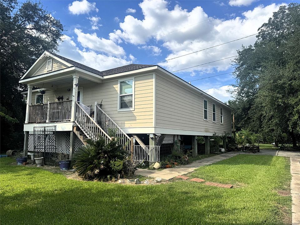 This charming home was built in 2011 and is elevated to alleviate flooding concerns. Featuring 2 bedrooms and 2 baths, there's also a formal dining room and an office that could be a 3rd bedroom! The rooms are spacious, including the walk in pantry. This home could use some TLC, and with a little work, it will be a show stopper again. Located in a quiet area with a great park right across the street. You will enjoy easy access to Spur 330/Hwy 146 and I-10. Please pardon the extra "stuff", an estate sale is in progress.