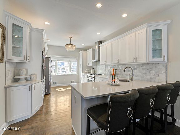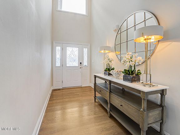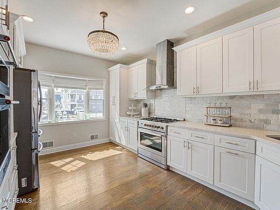Welcome to your waterfront paradise in the prestigious Baywood community of the Jersey Shore. This exceptional property promises an unparalleled lifestyle with direct access to Barnegat Bay from your private dock on the lagoon, making it a haven for boaters and water enthusiasts alike. Step into luxury within this 5-bedroom, 2.5-bathroom home, spread across a generous 3,250 sq ft of meticulously designed living space. As you enter into the sweeping two-story foyer, you are led into an open-concept floor plan featuring 10-foot ceilings and oversized Anderson custom windows. The residence has sublime hardwood flooring throughout, creating a warm and inviting ambiance. The grandeur is further elevated by premier crystal chandeliers that adorn the ceilings. The kitchen boasts shaker-style, white soft-close cabinetry and two floor-to-ceiling pantries. Custom pearl and subway tile backsplash adds the right touch of elegance to this spacious kitchen. Quartz countertops and top-of-the-line stainless steel appliances make this space perfectly equipped for the culinary enthusiast. The primary bedroom is a retreat within itself, featuring an en-suite bathroom with a sunken jacuzzi bathtub, a double sink vanity and stand-up shower. A custom walk-in closet with organizational shelving adds the ease of sophistication and convenience. Enjoy the breathtaking sunrise views from the attached private balcony while you sip your morning cup of coffee. Additional bedrooms offer generous space and storage. The laundry room is also positioned on the second floor for your convenience. The third floor hosts an expansive bonus bedroom with an abundant amount of storage. This private space captures the essence of tranquility with endless water views. The property's allure extends to the outdoor oasis allowing for an unprecedented waterfront experience. Enjoy serene views and direct entry to the water from your private dock, and relax in the fenced-in backyard, featuring stone pavers and a hot tub jacuzzi, perfect for unwinding or entertaining guests. This home captures waterfront living at its finest! Located within minutes of Brick Beach, a dog park and pickleball courts. Enjoy your daily bike ride and bird-watching as you are surrounded by nature sanctuaries. Reside in a community that values leisure and luxury. Embrace the opportunity to make this pinnacle property your new home, where every detail contributes to a lifestyle of impeccable comfort and prestige.