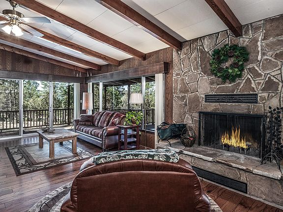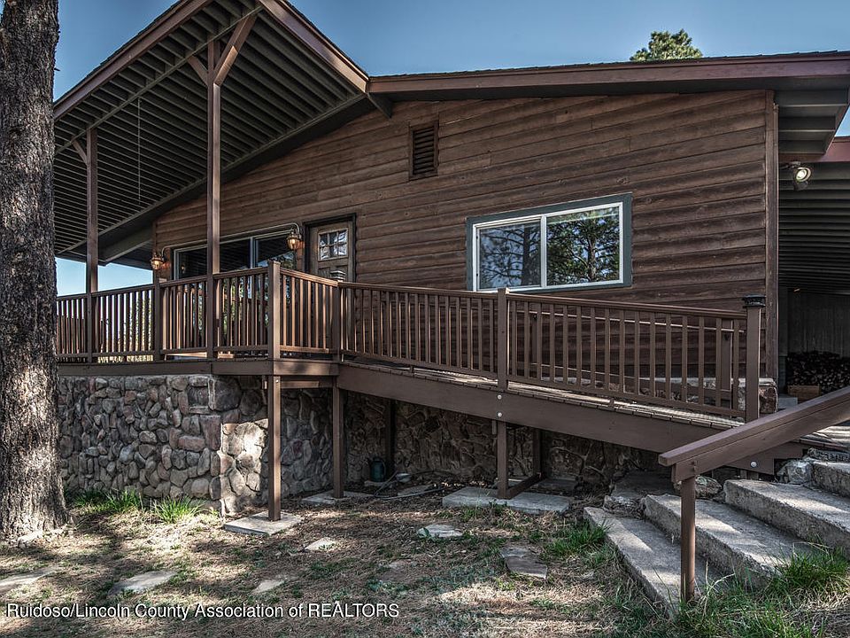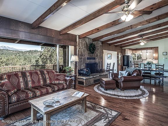 Absolutely unprecedented views from this 3BR 3BA Mountain Retreat. Open kitchen, living, dining floor plan with local Capitan stone wood-burning fireplace. Master suite and 2nd bedroom/bathroom on main level. 3rd bedroom/bathroom and 2nd living area/game room downstairs. . Large attached carport, and detached covered RV parking! Sits at the end of a private cul-de-sac. Unobstructed spectacular views from inside home and from huge TREX deck. See stunning sunsets, snow-capped mountains, Sierra Blanca, the Sacramento Mountain Range and The Links Golf Course #10 green. Home sits in the middle of 1.1 acre lot with mature pine trees and privacy. Short walk to 3.1 mile fitness trail. Shopping & dining nearby. Covered parking for multiple vehicles . Horses allowed. Adjacent lot available!