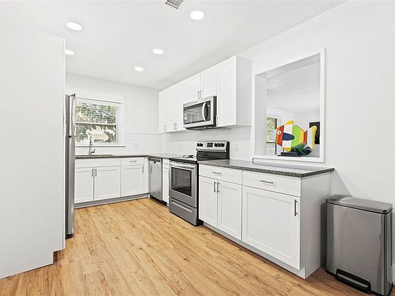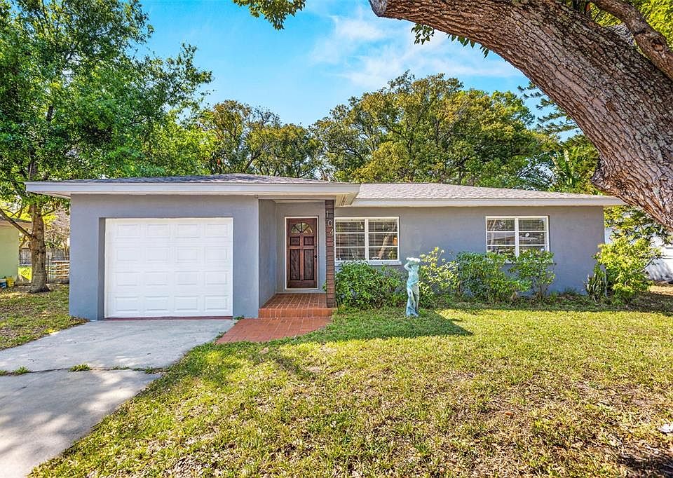 Move-in ready home in Clearwater's sought-after Skycrest neighborhood featuring a fenced backyard, two screened porches, attached garage, and in-home laundry. This single-story ranch blends restored hardwood floors in the living room and bedrooms with luxury vinyl plank in the kitchen, dining room, family room, and bath. The kitchen is highlighted by quartz countertops, stainless steel appliances, pantry storage, and an open flow into the dining area. Faux wood blinds provide privacy throughout, high-speed internet is available, and the garage includes a large washer and dryer. Outdoor living is a highlight with multiple screened porches and a private fenced yard. Conveniently located near US-19, St. Pete Clearwater International Airport, Countryside Mall, Publix, Walmart, parks, schools, downtown Clearwater, and Clearwater Beach.