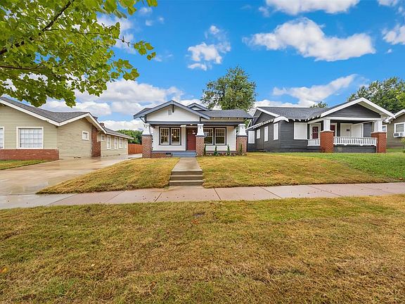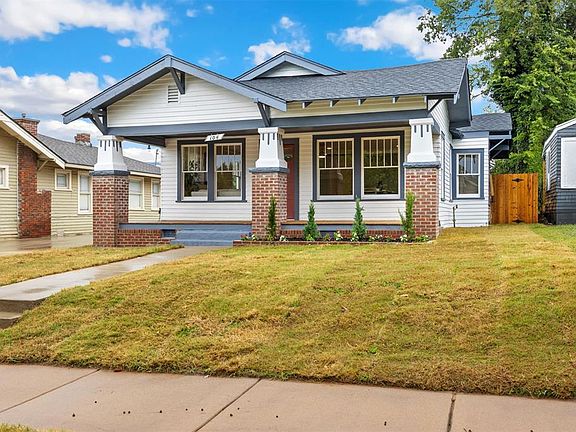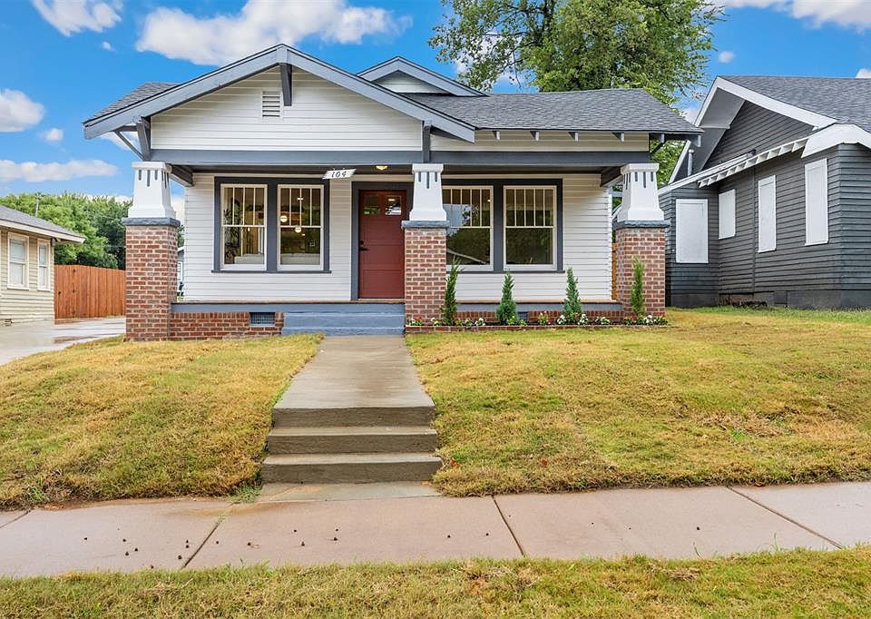 Welcome to 104 NW 20th St., a beautifully remodeled bungalow in the prestigious Heritage Hills community. This 3-bedroom, 2-bathroom home blends timeless charm with modern upgrades, offering style and functionality throughout. Step onto the inviting covered front porch, perfect for morning coffee or evening relaxation. Inside, you’ll find a cozy living area with an electric fireplace, wood floors that flow seamlessly throughout the home, and an open-concept layout connecting the living, dining, and first bedroom, making it ideal for flexible use. Exposed wood ceiling beams add character to the hallway, which leads to a spacious secondary bedroom and a full bathroom. Continuing on, the kitchen serves as the true centerpiece of the home with an oversized island, modern finishes, and a built-in breakfast nook. The primary suite is tucked away for privacy, complete with a walk-in closet large enough to impress and a thoughtfully designed bathroom featuring dual sinks and a walk-in shower. Step out back to enjoy the patio and built-in flower bed that frames the fenced yard. With a recently replaced roof as well as plumbing and electrical systems, this home offers peace of mind along with beautiful design.