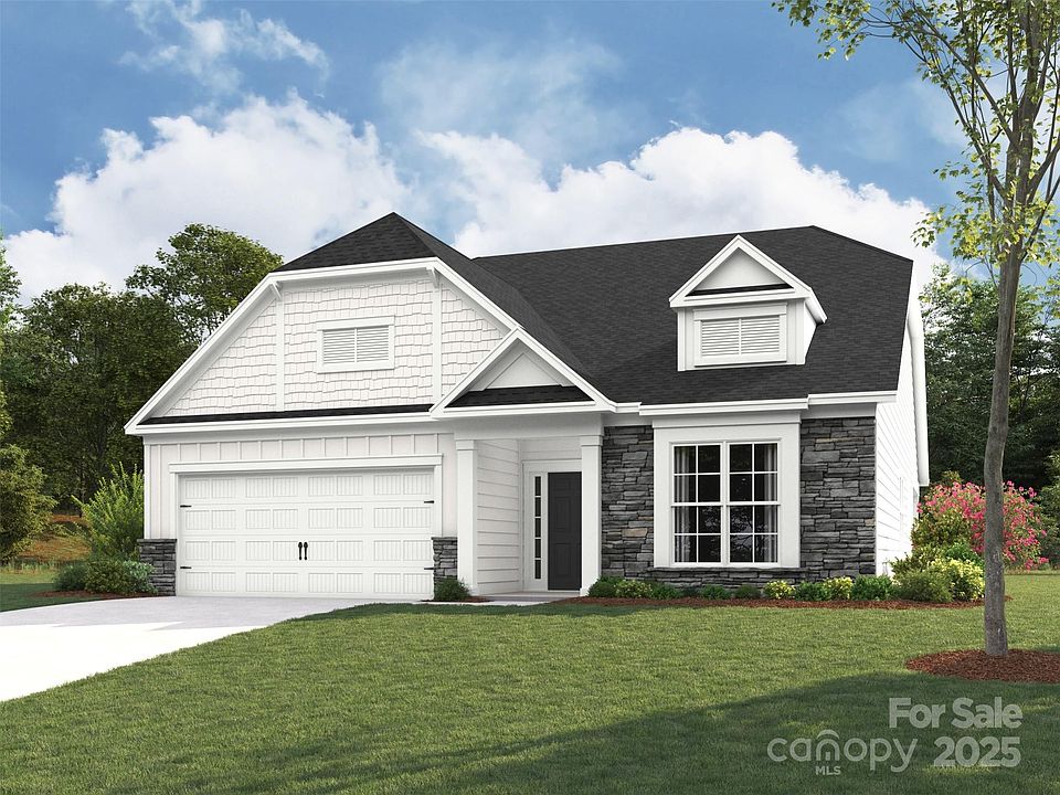 Charming 1.5-story home w/ Craftsman exterior featuring Hardie® siding & generous stone accents, & a rear covered porch. Off the foyer is a guest bed & full bath plus Flex room w/ French doors. Airy open-concept layout! Kitchen features light-painted perimeter cabs, granite counters, GE SS app w/ gas range, tile backsplash, walk-in pantry, SS undermount sink, & Butler's Pantry w/ base cabinets. Spacious Family rm w/ vaulted ceiling & gas fireplace w/ cabinet. First-floor Premier Suite has a tray ceiling & WIC; bathroom offers a soaking tub, separate tiled shower w/ semi-frameless surround, quartz counter, stained cabinets, & 12" x 24" tiled floor. Main floor is rounded out with a laundry room & mudroom w/ drop zone. Upstairs is a Rec room, guest bedroom w/ WIC, & full bath. LVP flooring throughout most of the first floor, w/ oak treads on stairs. Guest baths have tiled floors and stained cabinets. Community pool is under construction; other amenities include a clubhouse and dog park.