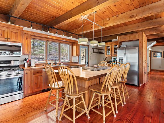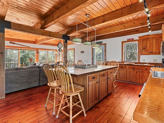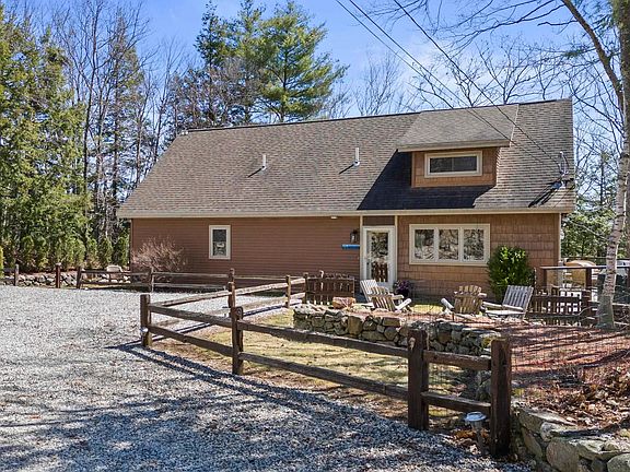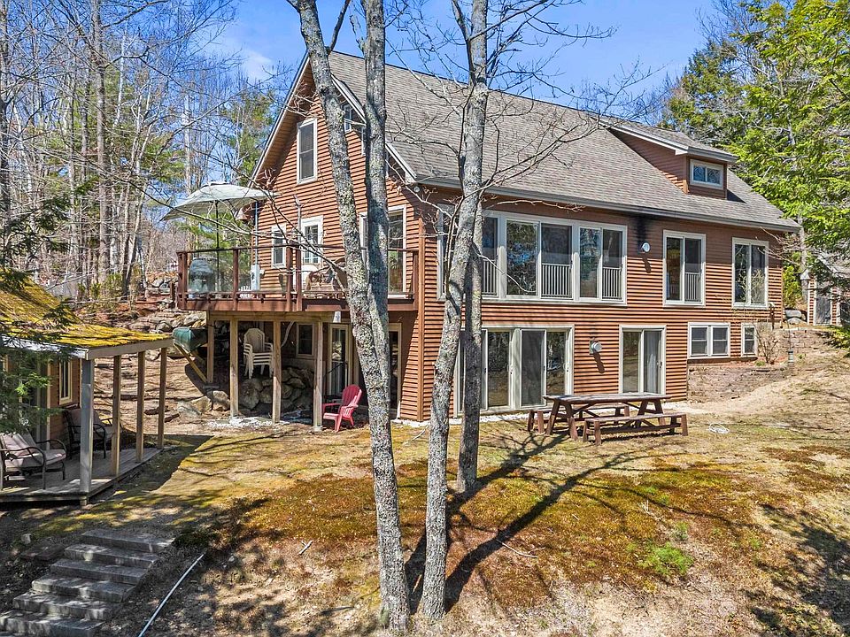 Establish your own COMPOUND. Property has 115' of lake frontage, an several sliding glass doors & windows, PLUS a large open deck. GREATviews of the lake, w/ undeveloped property on the distant shore of Rock Haven is protected from future development. Large open kitchen has loads of counter space + ''island'' that accomodates a small army! The efficient work space has wide pine board counters & marble tiles & a prep area, w/ bar sink & pantry storage. The LR, w/ cath ceiling & 4 sets of sliders, plus massive exposed beams. Rraised stone hearth accommodates a propane ''Franklin-style'' stove. There is KNOTTY PINE throughout! The dining area opens through sliding glass doors to large open deck -great for entertaining, overlooks grounds & cascading granite steps, leads to fire pit area & open deck at water's edge. Enjoy this tranquil view of the lake, or set out from the dock in your kayak or canoe to explore the miles of lake shore or just take a dip in the crystal waters. On the main level is a primary suite, plus a bunk room and a ½ bath. Upstairs, a huge closeted bedroom w/ cathedral ceiling & sitting area, + a full bath & a balcony-style loft area - perfect for TV room, playroom or additional living room. The lower level could easily be transformed into separate living quarters. The granite-topped bar area-great for entertaining, + gas stove, refrig., tile floors, 2nd gas "stove". This property checkes all the boxes and only 2 hours from Boston & an hour from skiing in NH.
