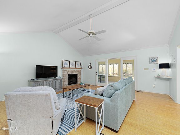 Inside, the living room features soaring cathedral ceilings that create a light, open feel, anchored by a cozy fireplace with gas logs—perfect for cool evenings. The spacious sunroom is a true highlight, offering peaceful water views and seamless access to the back deck, ideal for morning coffee, entertaining guests, or unwinding after a day on the water.