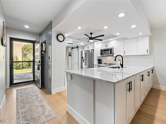 Rare opportunity to own this renovated and turnkey 3-bedroom and 2-bath end unit the heart of Fort Myers! This spacious, coastal condo offers no stairs, no one above you and a light and bright open concept. The kitchen offers KitchenAid stainless steel appliances, quartz counter tops, tons of storage space, pantry and sliders flowing out to the front patio which is perfect when grilling. The oversized primary bedroom boasts sliders going out to the patio and an oversized walk in close with built in organizers and shelving. Third bedroom can also be used as a flex room with slider going out to the oversized wrap around screened in lanai. The lush landscaping truly makes you feel like you are on an island but yet you are only STEPS away from Bell Tower Shops that includes Nordstrom Rack, Capital Grill, Dave and Busters, Tap 42, movie theater and so much more! Only a short drive to the beaches, MN Twins and Boston Red Sox Spring Training, Barbara B Mann and RSW Intl Airport. Roof was replaced in 2024. Tankless hot water heater. *Two pets with NO weight limits are allowed*