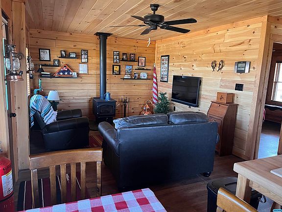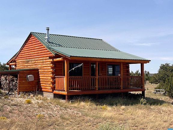 Cozy one bedroom, one bath cabin tucked away on 10.97 acres bordering BLM in Cimarron Ranch Subdivision, Quemado, New Mexico. 720 Sq. ft. log cabin features an open living/kitchen combo, wood floors tongue & groove pine walls and ceiling and a combo entry way/ laundry room. The covered decks in the front and the back afford views for miles. The home is heated with electric baseboards and a wood stove. The kitchen features a range, refrigerator sink and ample cabinet space. A built in gun safe is included. The water for the property is served by a gravity fed cistern and a pump. The community well for water hauling is approximately 2 miles away. A 400 sq. ft. outbuilding is complete with electricity. The property is approximately 27 miles from either Springerville AZ. and equal distance to Quemado N.M. This property could make a permanent home or a weekend getaway.