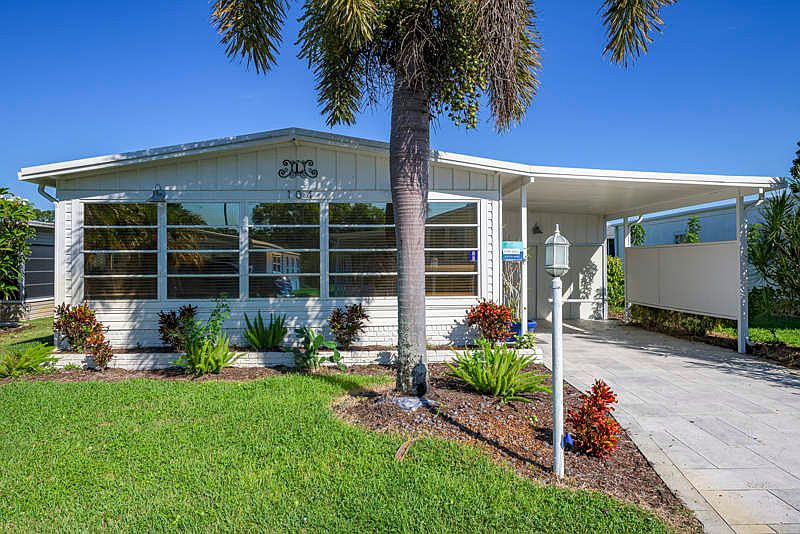 This 1225 square foot, 2.0 bed 2.0 bath Manufactured Home in the Marco Shores community of Naples, FL offers a cozy and inviting living space. This home features a spacious living room and dining area, a master bedroom with an en suite bathroom and walk-in closet, a fully equipped kitchen in addition to a convenient laundry room that offers full size washer and dryer. The large sunroom is exposed to the livingroom and kitchen, great for entertaining and relaxing.The exterior of the home includes a stamped concrete carport, shed, sprinkler system, mature trees on the property and vinyl siding.Residents of the Marco Shores community in Naples, FL enjoy a variety of amenities and activities. The community offers a newly renovated clubhouse, fitness center, and recreational facilities. The brand new swimming pool and a spa is a great place to relax with your friends. There are also social events and planned activities for residents to enjoy and meet their neighbors. Located in a prime location near shopping, dining, entertainment, and outdoor recreation options, Marco Shores is a desirable community for those looking for a comfortable and active 55+ luxury lifestyle in Southwest Florida. Contact us today before this beauty slips by!