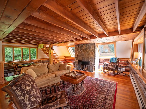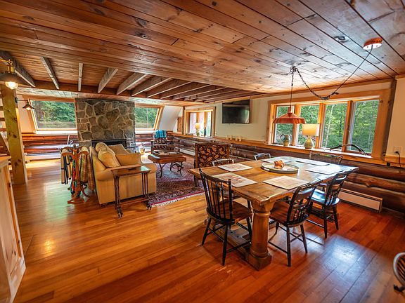 Lovely expanded and woodsy A-frame home just outside the village of Wilmington and near Lake Whitingham, with easy access near a paved town road. This cozy Vermont retreat sits on 11 acres bordering a year round stream, with established walking trails, pond, perennial landscaping, gorgeous stone walls, and more. The home itself features a large open concept floor plan with lovely rustic living room with sunken stone fireplace with newly redone chimney, great natural light and exposed woodwork, spacious dining area, upscale kitchen with granite counters and stainless appliances, walk in pantry, secondary family room in the addition with large windows, two main floor guest bedrooms and an upgraded guest full bath, an upstairs primary suite with vaulted ceiling, spa like bath with pedestal tub, and walk in closet, lower level guest bedroom and brand new 3rd bath, large mudroom with ample storage for gear, new laundry, and large garage with tremendous storage. Additionally there is a detached garage for toy storage complementing the direct snowmobile trail access, a fire pit patio, ample parking, and an old tennis court that could be rehabbed or used as a base for some new exciting venture. The country enjoyment and possibilities are endless!