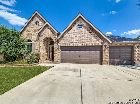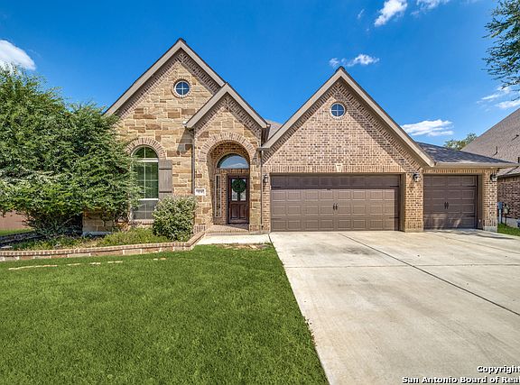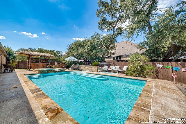 Welcome to your resort-like oasis. This home is situated on over a quarter of an acre of picturesque land. As you step into the grand entrance, you are greeted by a long and spacious hallway adorned with plentiful windows offering tons of natural light. The highlight of this property is the outdoor area featuring a heated swimming pool, a tiki bar, and a Jacuzzi. The backyard is completely private! Imagine unwinding on the back porch swing and watching the deer greet you. The true greenbelt backs up to Potranca Creek. This beauty boasts ample living space, including an additional living/game room for relaxation, a formal dining room , and a private office perfect for remote work. This home truly combines the tranquility of nature with the conveniences of modern living, creating a perfect retreat for those seeking both privacy and luxury.