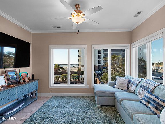 Welcome to Atlantic Harbour J-1, an updated end-unit condo with water views and boat slip in the heart of Downtown Morehead City. Enjoy the convenience of dining, shopping, fishing tournaments, seasonal festivals, and waterfront events just outside your door, with Atlantic Beach and Beaufort only minutes away. Enter the open-concept living area, where bright windows frame views of the harbor and downtown. French doors lead to a patio with coastal breezes. The kitchen offers stainless steel appliances, granite countertops, and breakfast bar seating, with a nearby laundry room and pantry cabinet for everyday convenience. Tile flooring adds durability throughout the main living spaces. Both bedrooms offer comfort with carpet and ceiling fans, and all bathrooms mirror the granite finishes found in the kitchen for a cohesive style. The primary bedroom features a beautiful coffered ceiling and serene water views, with an ensuite boasting a tile walk-in shower and a jetted soaking tub perfect for unwinding after long days on the water. The second bedroom is bright and comfortable, paired with a full hall bath to accommodate guests with ease. A private garage offers exceptional flexibility with a second kitchen, cabinetry, and workspace—ideal for prepping for entertaining or a day on the boat. The unit includes Boat Slip #55, accommodating a 32' boat and positioned at the end of the middle finger pier closest to the sound. Lounge at the community pool before heading downtown for dinner and live music or take advantage of the hard-to-beat ability to launch, dock, dine, and return home with ease. With downtown energy and waterfront access, coastal living isn't reserved for weekends. At Atlantic Harbour J-1, it becomes part of your every day. Don't miss this rare opportunity to live the lifestyle most only get to visit.