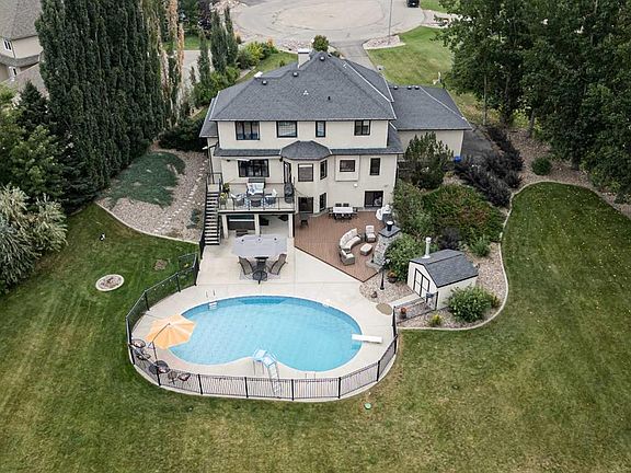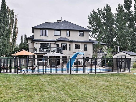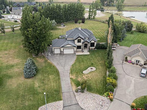 Welcome to your private country retreat just minutes from the city! This beautifully updated, fully finished home offers nearly 2,841 sq. ft. above grade plus an additional 1,531 sq. ft. in the bright walkout basement — almost 4,372 sq. ft. of developed space on 1.17 acres in a peaceful cul-de-sac. Step inside to a soaring front entry and a formal dining room with warm hardwood floors flowing into a spacious great room featuring a cozy gas fireplace and custom built-ins. Just off this gathering space, a rear patio with retractable awning and natural gas hook-up creates an ideal BBQ and outdoor dining area. The gourmet kitchen is designed for everyday life and entertaining — enjoy morning coffee in the sunny breakfast nook, prep dinner at the oversized butcher-block island, and keep organized with a built-in desk and generous walk-in pantry. Freshly refinished cream cabinetry adds timeless appeal. A dedicated home office with high ceilings and custom built-ins is perfectly positioned near the front entry. The main-floor laundry room offers abundant storage and a sink, while the mudroom connects seamlessly to the oversized, heated triple garage — a practical setup for busy families. Upstairs, the primary suite is a true retreat with a tray ceiling, expansive custom walk-in closet, and spa-inspired ensuite featuring a soaker tub and multi-jet tile shower. A maple spindle railing hallway separates the primary from three additional bedrooms. The main bath offers dual sinks and a separate shower/toilet area for easy shared use. The walkout basement was made for entertaining — bright with natural light and anchored by a freshly renovated wet bar with sleek wood countertops, stunning cabinetry, and high-end appliances (dishwasher, ice maker, wine & beverage fridges included). A beautiful feature wall with built-ins and custom rockwork creates the perfect game-day space. Three versatile rooms provide endless options: home gym, guest suite, or music room. A newly updated bathroom with tiled shower and floating vanity adds style and convenience. Step outside to your own backyard oasis: a heated inground saltwater pool for April–October swims, a six-person hot tub with built-in audio, and an 800 sq. ft. composite deck with outdoor fireplace for cozy prairie nights. In winter, the adjacent pond transforms into your private skating rink. Extras include in-floor heating on every level, full-property irrigation (even planters), and built-in audio indoors and out. The pool area is fully fenced, and Gemstone lighting sets the perfect evening glow. Located in Vista Meadows, you’ll enjoy in-town services — including septic and water treatment — with an out-of-town feel. School bus pickup is right at your door, and city amenities like restaurants, coffee shops, and greenhouses are just minutes away. Best of all, this home is move-in ready so you can start enjoying it from day one.