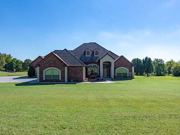 Beautiful gated community and energy efficient home! Home is placed on 1.66 acres with a creek nestled at the foot of the property. Property includes a completed 25' x 40' brick insulated shop with a half bathroom, covered patio, and coded garage entry. Large covered patio with ceiling fans, gas hookup, and surround sound that leads out to the pool. Concrete pool with swim out, sundeck, and diving board that is completely fenced with three gated entries. Property also includes an in ground storm shelter and sprinkler system that covers the property along with misters for the garden areas. Home has hardwood floors and tile throughout the home. Wide hallways accommodates wheelchairs and walkers perfectly. All bedrooms are large and have walk in closets. Large kitchen with two ovens and a range with both gas and electric hookups. Ton of storage though out. This home has so much to offer!