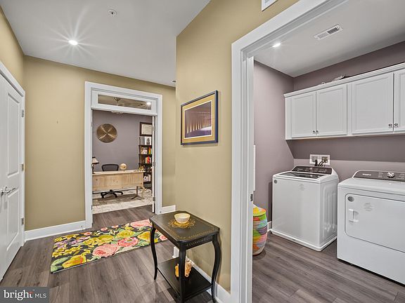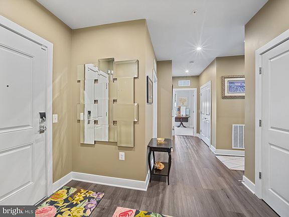 Welcome to 104 Saint Ives Place, a top-floor corner home just steps from National Harbor’s dining, shopping, and cultural attractions. This modern residence stands out with its dedicated electric vehicle charger and secure garage with key-fob access, providing the convenience and sustainability today’s buyers are looking for. The chef’s kitchen features a large island, quartz countertops, shaker cabinetry, designer backsplash, and premium appliances including a double oven, stovetop, and chimney hood. The open-concept living and dining area is bright and inviting, with luxury vinyl plank flooring, recessed lighting, ceiling fans, motorized window treatments, and custom California closets. Step outside to enjoy fresh air and a tree-lined view from your private balcony. The main suite offers a walk-in closet and a spa-like bath with a double vanity and a tiled walk-in shower with a built-in bench. Additional highlights include a dedicated laundry room, tandem parking for two vehicles, elevator access, and a mailbox conveniently located in the building foyer. Elegant, bright, and move-in ready — an ideal opportunity to enjoy National Harbor living at its best.