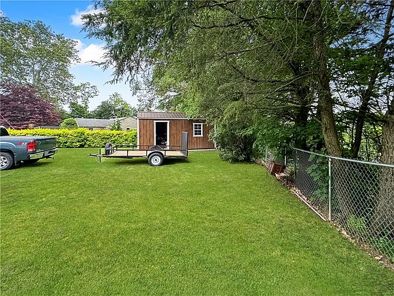 Pretty 2-bedroom brick Cape Cod situated on a large, level lot—perfect for outdoor living. The partially fenced yard features a deck and a huge storage shed, ideal for motorcycles, bikes, a craft room, or extra storage. Inside, you'll find an open-concept living and dining room with exposed hardwood flooring. The eat-in kitchen leads directly to a side deck—great for grilling or relaxing. The main floor includes a bedroom and a full ceramic tile bathroom. Upstairs offers a spacious second bedroom spanning the entire floor. The lower level features a finished game room, another full bathroom, updated mechanics, a separate laundry room with washer and dryer, plus an extra refrigerator that stays. One-car garage and a charming front porch complete the package.