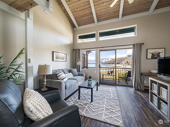 Rare opportunity to own in the desirable Spader Bay Condominium waterfront community; known for its great location just 1 mile w/ path to downtown Chelan, an expansive private, low bank 600’ sandy beach, grassy waterfront, private T-dock, Olympic-sized pool, 2 hot tubs, mooring buoys, boat trailer storage, clubhouse & community amenities w/ playground, pickleball, basketball, volleyball, sports courts & more. This top floor, level-entry, corner unit features stunning lake views, a sunny deck off the vaulted great room/living area, an open kitchen + a spacious loft w/ an upper bedroom, bunk & powder room. Tourist Accommodation zoning & an on-site manager allows for short-term vacation rental opportunities with exceptional service & security.