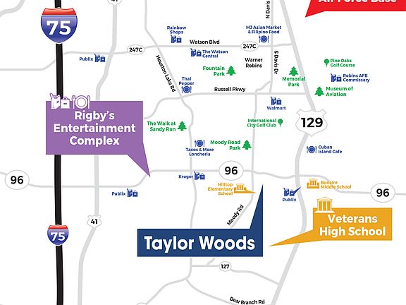 JUST 3.7 MILES FROM WARNER ROBINS AIR FORCE BASE, LARGE FULLY SODDED SPACIOUS LOTS, ONE LEVEL RANCH HOMES ONLY, SOUGHT AFTER VETERANS HIGH SCHOOL DISTRICT.