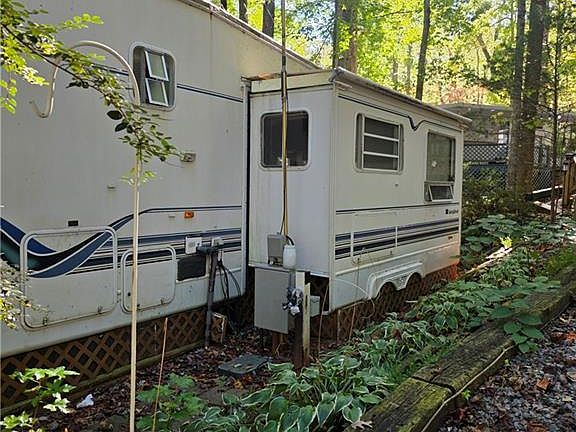 Tucked inside a well-kept campground community, this beautiful 1BR/1BA camper blends resort amenities with cozy home comfort. The pool and clubhouse are just a short stroll away, and a tree-lined stream along the campground invites relaxed fishing and quiet mornings outdoors. Inside, enjoy a full kitchen with gas stove and oven, a kitchen table for meals or games, and a comfortable living room for unwinding. Entertain day or night under the lighted BBQ pavilion, or savor the breeze on the large covered front porch with ceiling fan and blinds. A separate utility building adds everyday convenience with washer/dryer hookups and a bathroom (toilet & sink)—perfect for guests and longer stays. Easy, low-maintenance living with all the campground perks.