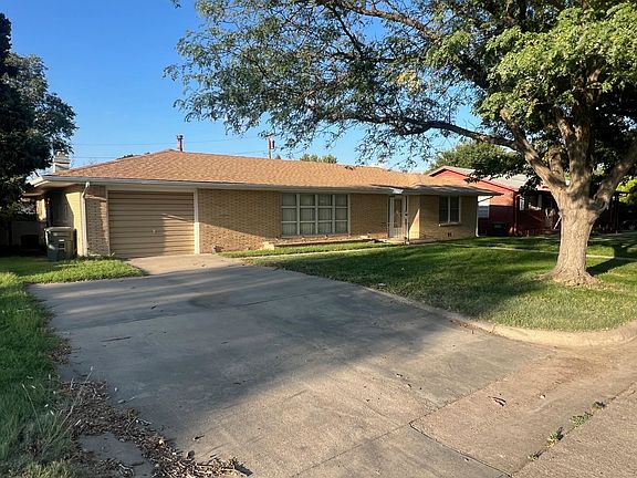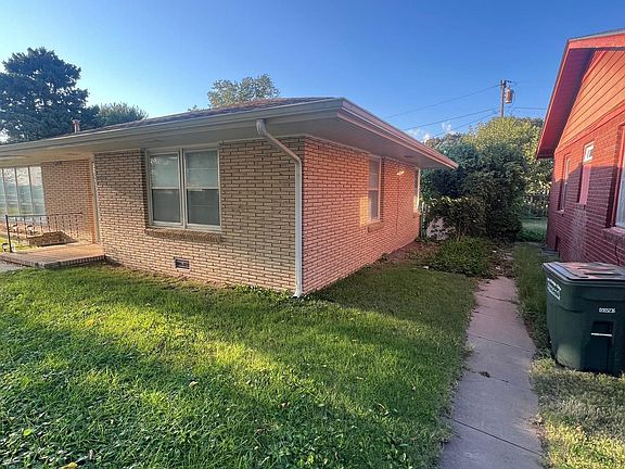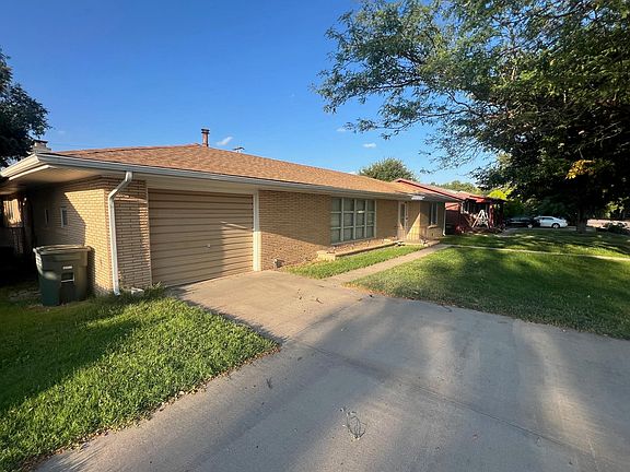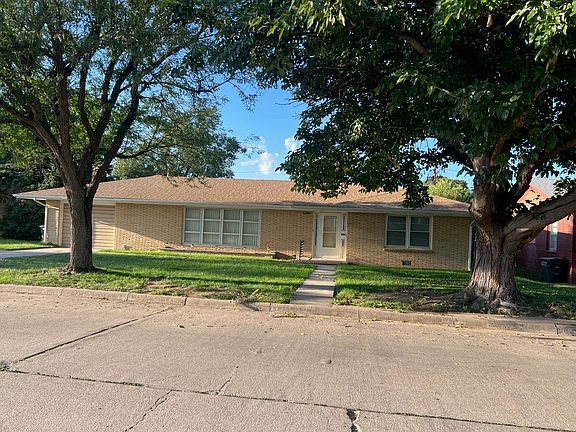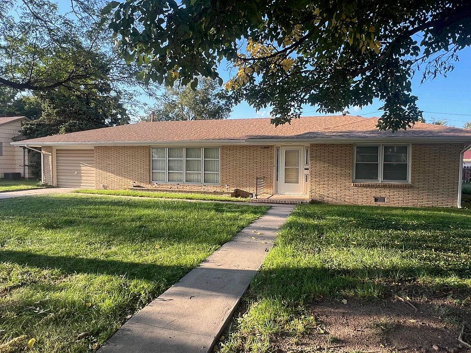 This property is being sold via public auction on Saturday, October 18, 2025 at 3:00 pm on location. Welcome to this charming single-family ranch-style home in the heart of Dodge City, KS. Built in 1954, this 1,980 sq. ft. residence is constructed of a timeless blonde brick exterior with a composition shingle roof and concrete foundation. Step inside to a spacious living and dining room combination, where a large picture window fills the space with natural light. The living room measures 23 ft. x 11 ft. and the adjoining dining room, 8.5 ft. x 11 ft., creates a welcoming flow into the kitchen. The kitchen features linoleum flooring, an electric stove, ample cabinetry, an eat-up bar, and convenient washer/dryer hookups. Just off the kitchen is a full bathroom with a sink, toilet, and stand-up shower. The main floor offers three comfortable bedrooms with original hardwood flooring. The primary bedroom measures 13 ft. x 13 ft. and includes dual reach-in closets, a built-in vanity, and storage drawers. The second bedroom measures 12 ft. x 10 ft. and offers a reach-in closet with overhead storage, while the third bedroom, located near the kitchen, measures 9 ft. x 10 ft. and also includes a reach-in closet. A fourth bedroom, measuring 19 ft. x 13 ft., provides incredible versatility, as either a bedroom or a den. This oversized space boasts wall-to-wall carpet, abundant closet and shelf storage, and direct access to the backyard. An additional full bathroom with a bathtub, single sink vanity, toilet, and linoleum flooring serves the main level. The partial basement expands the living space with a 15 ft. x 20 ft. family room featuring four large closets, carpet flooring, and a cozy gas fireplace with a brick hearth. With four bedrooms, two full bathrooms, and spacious living areas, this well-maintained ranch offers the perfect blend of character and functionality in a desirable Dodge City location. Open Houses Sunday, September 28, 2025, 2:00 – 4:00 PM Wednesday, October 1, 2025, 6:00 – 7:00 PM Sunday, October 5, 2024, - 2:00 – 3:00 PM Or, for a private showing, please contact Mike Burkhart @ 620-430-2000 *Please allow for 24-hour notice when scheduling a private showing*