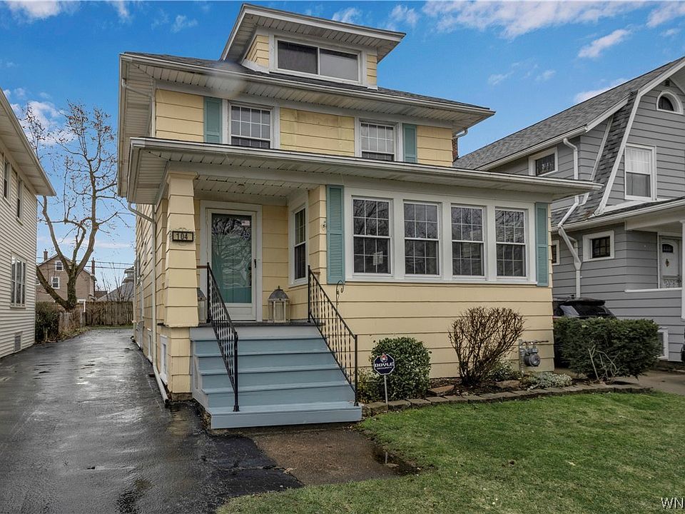 One block from the heart of Kenmore, this classic village home offers easy access to all the shops and restaurants on Delaware Ave. Step inside to the warmth and character of this beautiful home with a large living room featuring a brick mantle and gas fireplace as well as original leaded glass windows throughout the first floor. The front room boasts new windows on three sides, filling the space with natural light. The kitchen features an attached breakfast room, perfect for casual meals or morning coffee. The spacious primary bedroom contains a full wall closet for ample storage space, and the second story sunroom provides a peaceful retreat and additional living space. This home has been thoughtfully prepared for sale, including a brand new full tear off roof (50 year transferable warranty) and gutters, new vinyl windows, a freshly painted exterior and dry locked basement. Outside, the tucked in rear patio and lack of garage allows for more yard space for outdoor activities and entertainment. There is also a storage closet for landscaping equipment on the driveway side of the house. Don't miss your chance to make this wonderful property your own!