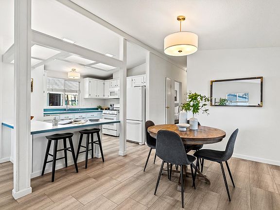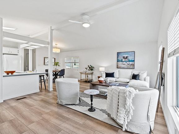 Enjoy the ultimate coastal lifestyle in this beautifully updated two-bedroom, two-bathroom 1,060 sqft home, ideally situated in a vibrant 62+ Senior Community just minutes from Pleasure Point, boutique shops, cozy cafes, restaurants, Capitola Cinema, and the Capitola Mall. Step into a spacious yet inviting living room featuring high ceilings that flow seamlessly into the chef's kitchen, complete with a gas range, built-in microwave, refrigerator, dishwasher, breakfast bar, and generous storage. Tucked privately at the end of the hall, the expansive primary suite offers vaulted ceilings, a refreshed en suite bathroom with a step-in shower, and linen closet for added convenience. The second bedroom is ideal for guests, hobbies, or a home office, sits near the laundry room with built-in cabinetry. Recent upgrades include fresh interior and exterior paint, updated vanities and mirrors, stylish new light fixtures, and enhanced insulation. Enjoy the tranquility of a quiet street with no front neighbors and a grassy side yard awaiting your personal touch, along with a storage shed. A warm, welcoming community just moments from the beach awaits you.