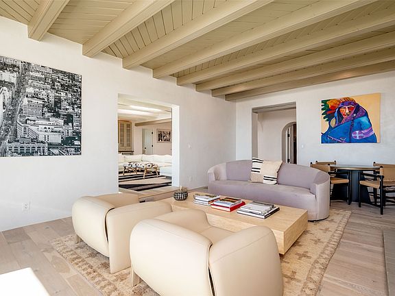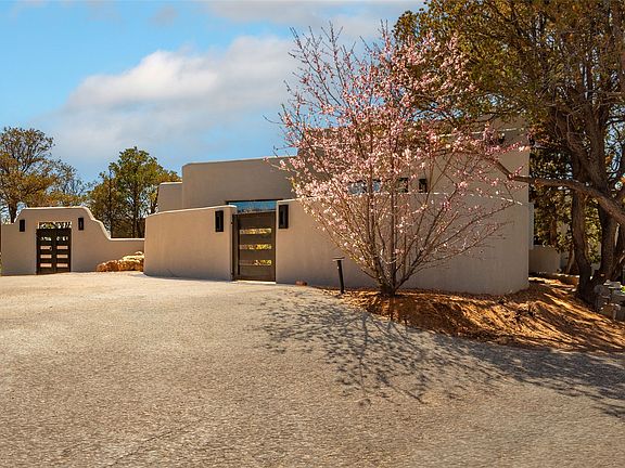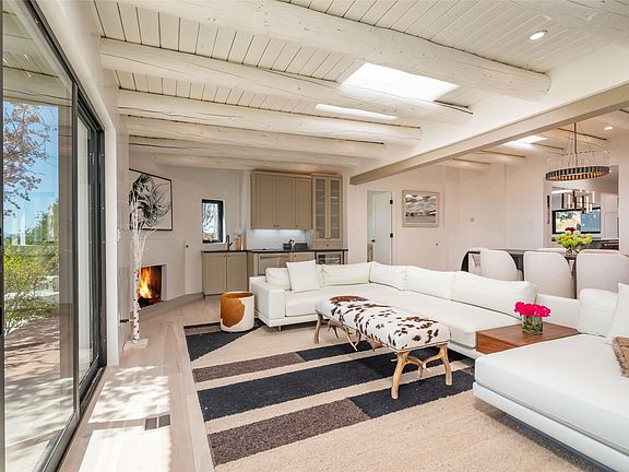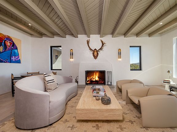 Totally renovated 5 bedroom 4.5 bath opulent Contemporary Pueblo style compound with stunning mountain views. Main home includes new insulation, windows, roof, stucco, plumbing, electric and HVAC. Modern vigas and beams, plaster walls, all wood and tile floors. Two spacious living areas with fireplaces. Exquisite epicurean kitchen is appointed with high end appliances, sleek white cabinets with specialized colorful tile backsplash, sizable center island with prep sink and comfortable seating for 5, and an office area with built-in desk. Elegant dining room for more formal entertaining. Luxurious primary suite with 2 sitting areas, access to an outside patio and a generous spa-like bath. Roomy laundry room with plentiful storage and utility sink. Property includes a 722 sq. ft. 1 bedroom 1 bath guesthouse with full kitchen, built-in banco, and its own laundry room. Enjoy summers in your completed redone private pool. Multiple patios, portals and outdoor kiva provide space for entertaining on a grand scale. 4-car detached garage. This is a not-to-be-missed estate on almost 8 secluded acres (2 separate parcels) of the Southwest’s most beautiful landscape minutes from both the historic Santa Fe Plaza and Bishop’s Lodge Resort.