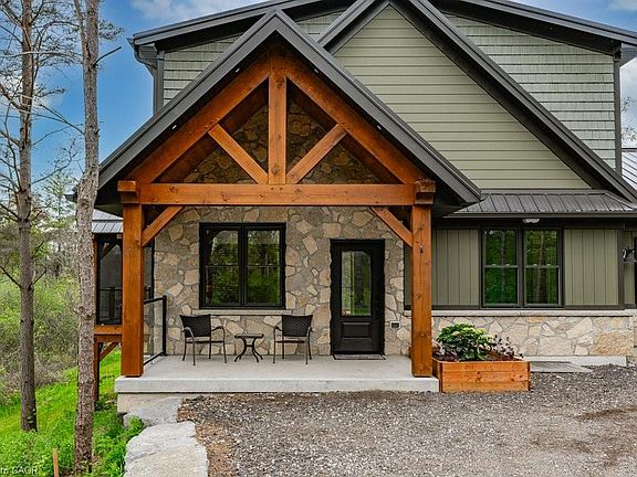 MUSKOKA WITHOUT THE DRIVE! This spectacular custom built home is within a 2.48 acre forested setting! The unique design of this home exemplifies the feeling of a northern luxury chalet! Loaded with high quality building materials and finishes and just built in 2021, this stunning home is a rare offering! The main floor provides an open floor plan with a soaring 20 foot vaulted ceiling framed with gorgeous wood timbers! The gourmet kitchen offers beautiful stainless appliances including an induction cooktop, a large centre island, quartz countertops and beautiful Moroccan style backsplash! A large great room with stone fireplace and dining area provide seamless flow for entertaining and expansive views of the forested backdrop! Step out to the massive deck and screened in room complete with remote retractable walls to increase the deck space for continued opportunity to entertain and enjoy the private surroundings! The main floor also offers a large bedroom/den and a full bathroom for those would prefer main floor living! A separate laundry room with cabinetry and access to the double car garage complete this level. A gorgeous wooden staircase takes you to the upper loft level with an incredible view of the main floor and outdoor surroundings! An office nook in the loft is ideal for those who work from home! An additional bedroom with walk through closet with built-ins and 3 piece ensuite with large walk-in shower serves as a primary retreat! Another hardwood staircase takes you to the walk-out basement with large finished family room with propane stove fireplace and an additional bedroom/den! The attached large double car garage is great for parking and all of your storage needs with loads of cabinets! An additional 19 x 15 detached garage is ideal for the toys and hobbyists! This home is truly stunning and a one of a kind dream private oasis and getaway from the city but is a short drive to Cambridge and Hamilton! Luxury Certified.